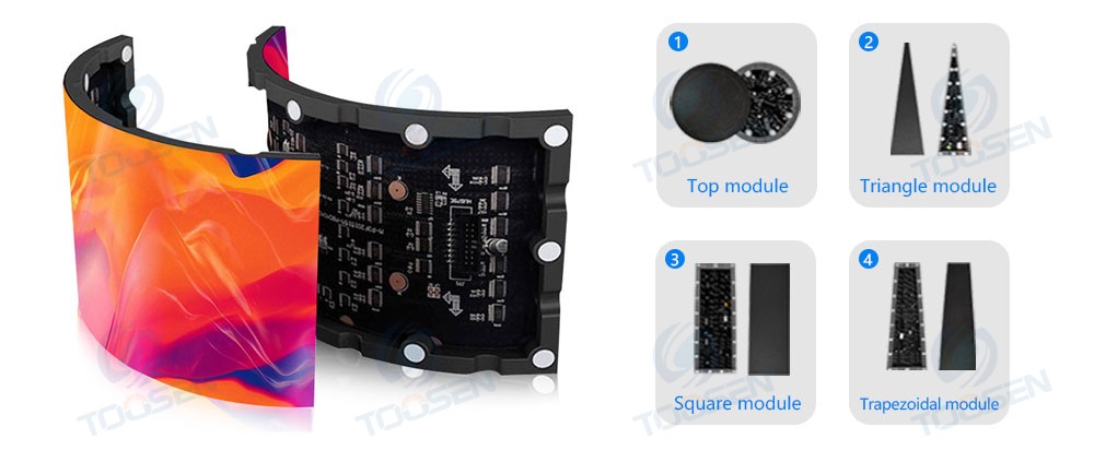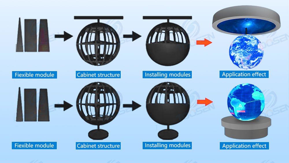 utilizing flexible LED modules, allowing images and videos to be viewed from any angle and direction.